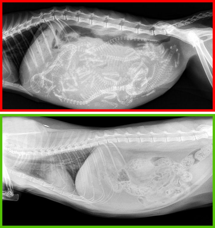Fent egy várandós macska röntgenképe, alul egy ivartalanítotté látható.