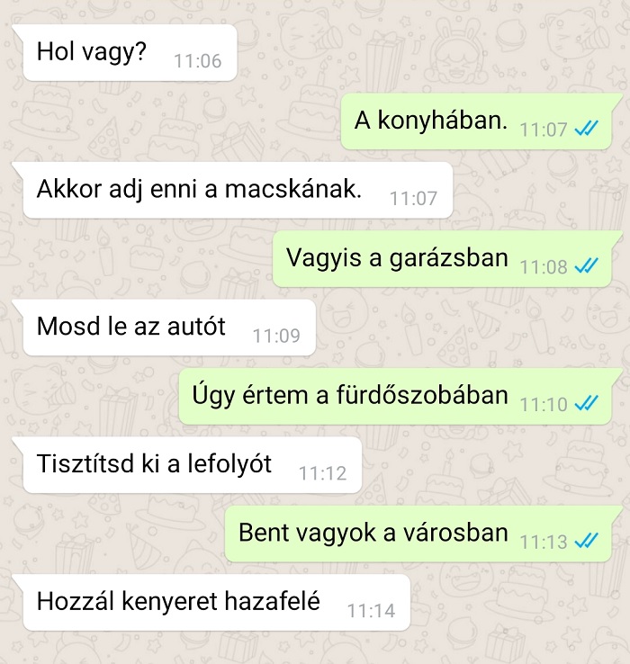 2. Feleség: Légy szíves hozzál tejet, kenyeret, és vajat a boltból.