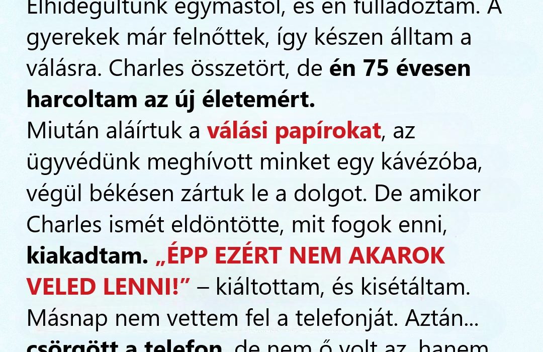 Azonnal a kórházba sietett. Megfogta Charles kezét, bocsánatot kért, és megígérte, hogy ezután ugyanazzal az odaadással fordul felé, ahogyan ő szerette őt mindig. Nem kerestek nagy szavakat, mégis mindketten tudták, mi történt. A szeretet néha elveszik a félrebeszélések között, de van út vissza.