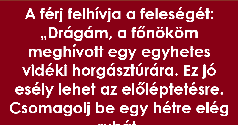 A férj felhívja a feleségét: „Drágám, a főnököm meghívott egy egyhetes vidéki horgásztúrára. Ez jó esély lehet az előléptetésre. Csomagolj be egy hétre elég ruhát, készítsd össze a horgászbotomat és a horgász ládámat, és ne felejtsd el a kék selyem pizsamámat sem.”