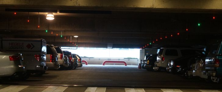 Garázs, zöld lámpákkal, üres helyeket jelölve.