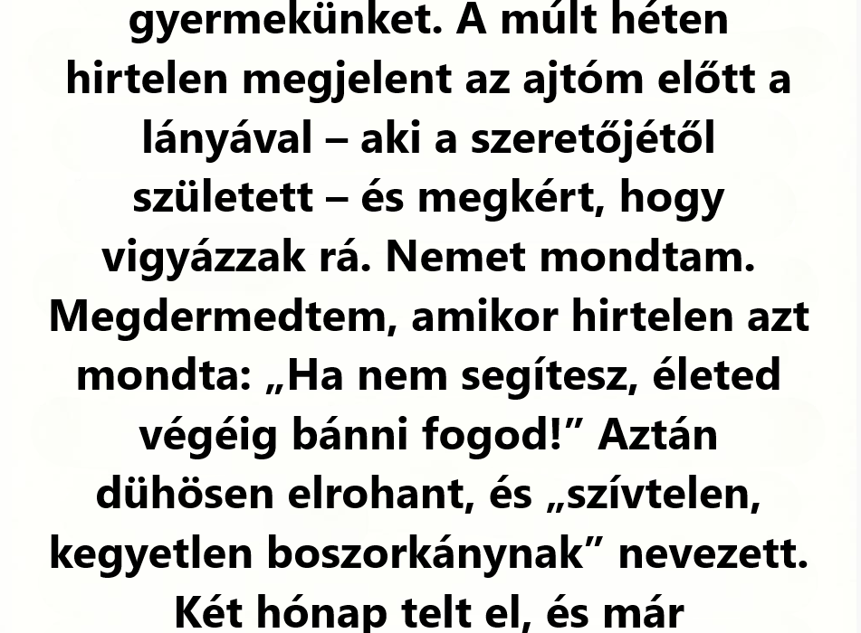 Könnyed hangon beszélt, szinte lazán. Azt mondta, egy időre segítségre van szüksége. Tudnék-e vigyázni a kislányra? Csak átmenetileg. Mintha a csend, az eltűnés, és az a hosszú újjáépítés sosem történt volna meg.