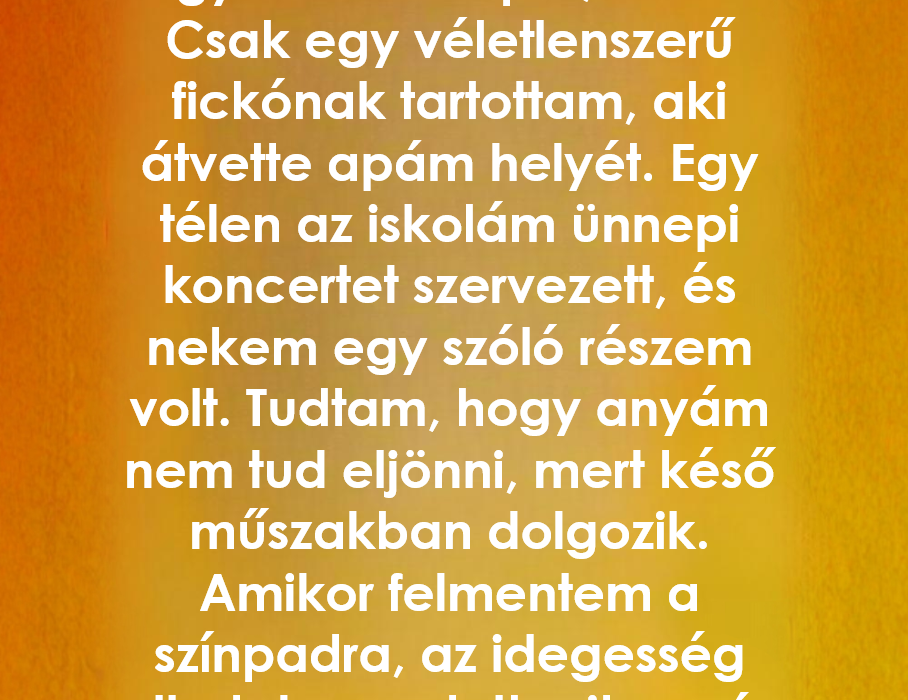 Anyukám a munkája miatt nem tudott eljönni, így teljesen egyedül léptem fel a fényes színpadra. Reszketett a kezem, elcsuklott a hangom, és egy pillanatra lefagytam.