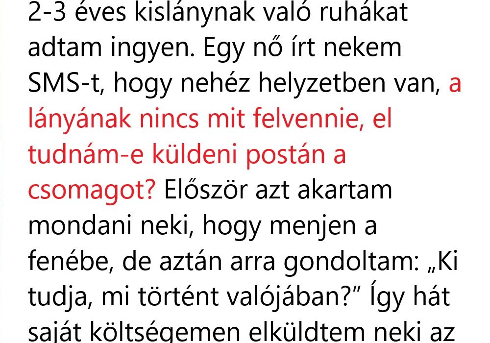 Közel egy év múlva csomag érkezett hozzám. Benne ugyanazok a pici ruhák, frissen kimosva, gondosan összehajtva, és egy kézzel írt levél. Megköszönte, hogy akkor segítettem, amikor a legnehezebb volt. Azt írta, ezek a ruhák átsegítették a gyerekét a hideg éjszakákon, és megtartotta őket addig, amíg volt ereje hálával visszaküldeni.