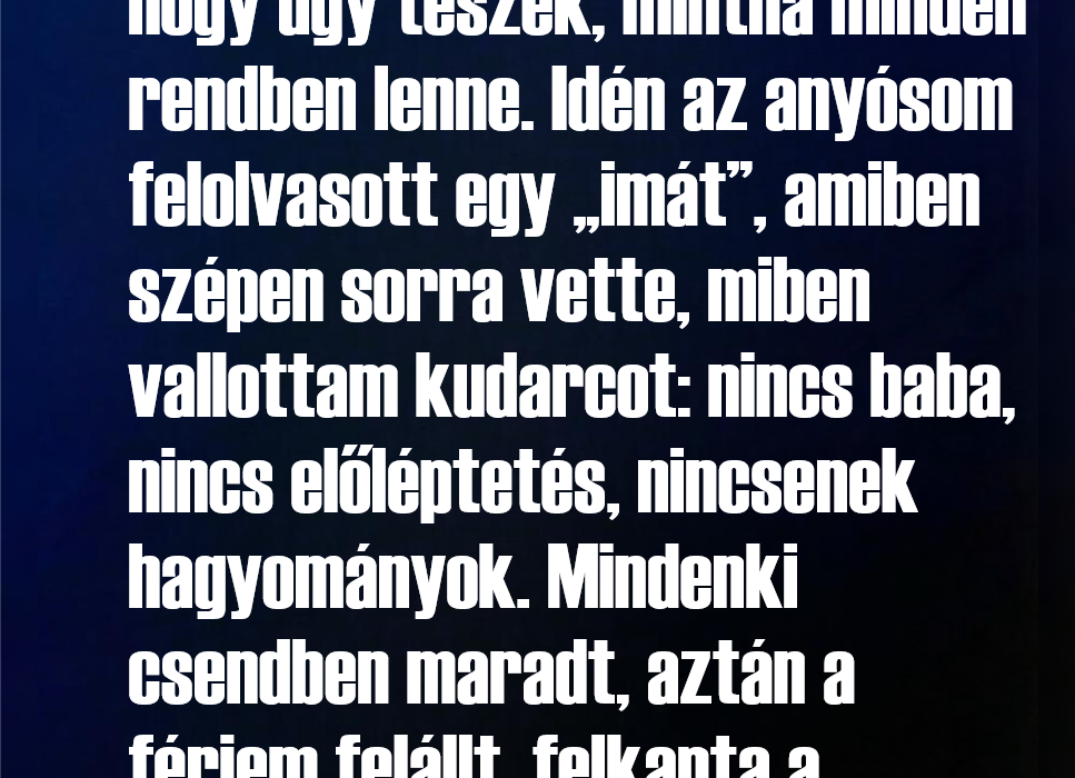 Amikor véget ért az ima, ment tovább minden, mintha mi sem történt volna. A levegő mégis nehezebb lett. Próbáltam magamnak bemesélni, hogy engedjem el, az ünnepek amúgy is bonyolultak, és az emberek néha ügyetlenül fejezik ki az aggódásukat.