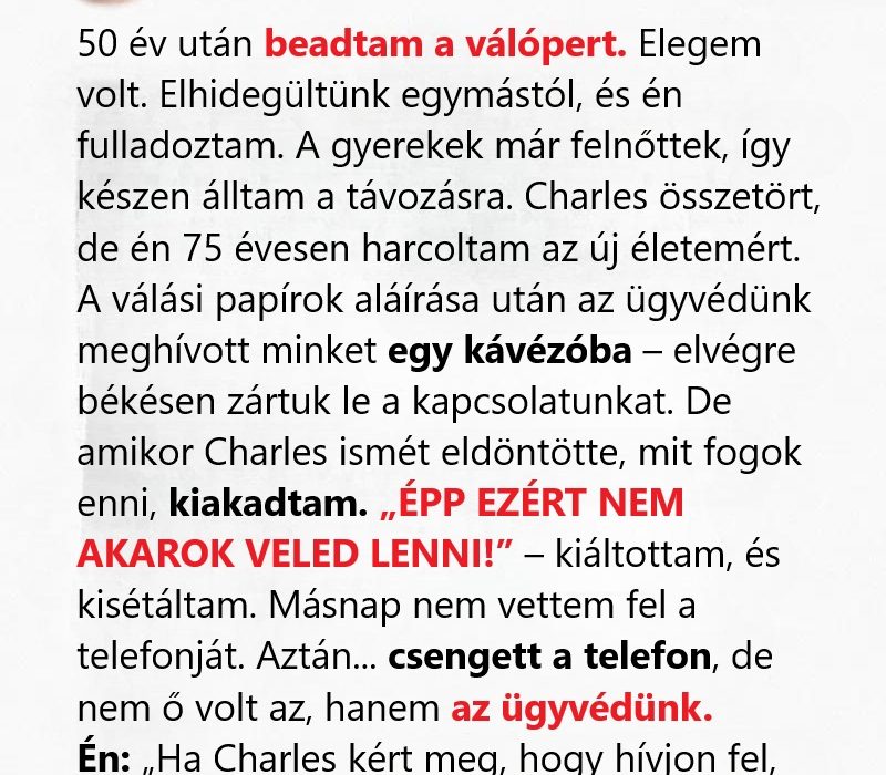 Azonnal a kórházba sietett. Megfogta Charles kezét, bocsánatot kért, és megígérte, hogy ezután ugyanazzal az odaadással fordul felé, ahogyan ő szerette őt mindig. Nem kerestek nagy szavakat, mégis mindketten tudták, mi történt. A szeretet néha elveszik a félrebeszélések között, de van út vissza.