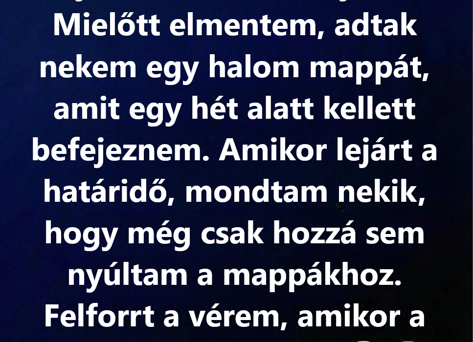 „Mielőtt elmész”, mondta, és elém csúsztatott egy csomó mappát, „meg tudnád csinálni ezeket a jelentéseket jövő péntekig? Sokat segítene az átadásban.”