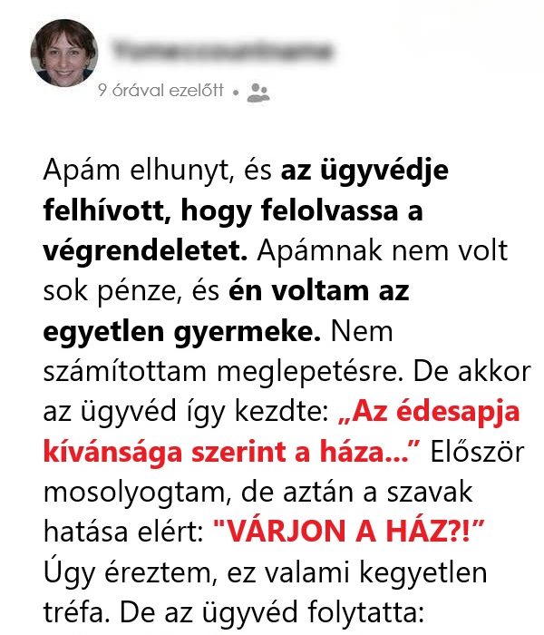 Nem számítottam semmi különösre. Aztán az ügyvéd elkezdte: „Édesapja végakarata szerint a háza…”