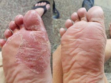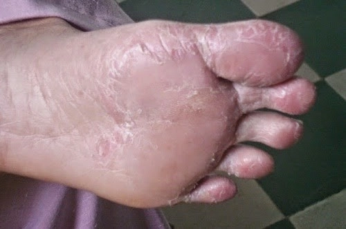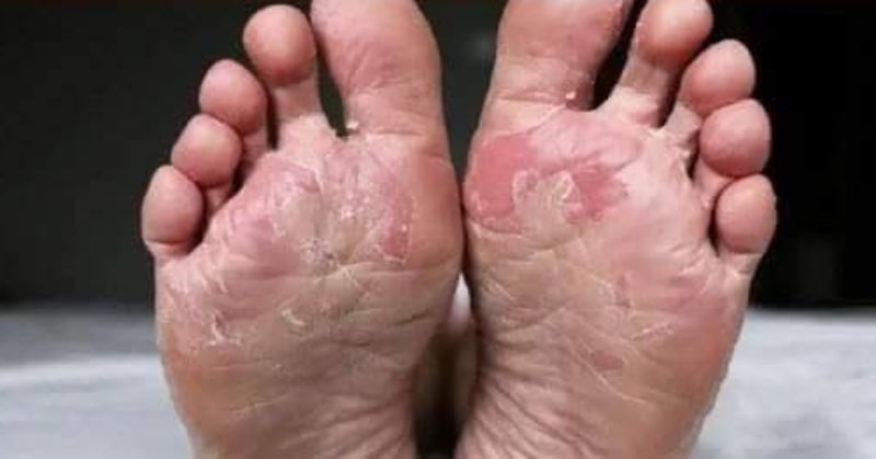 -Kiszáradt, hámló bőr, mély repedésekkel a sarkon vagy a talpon.