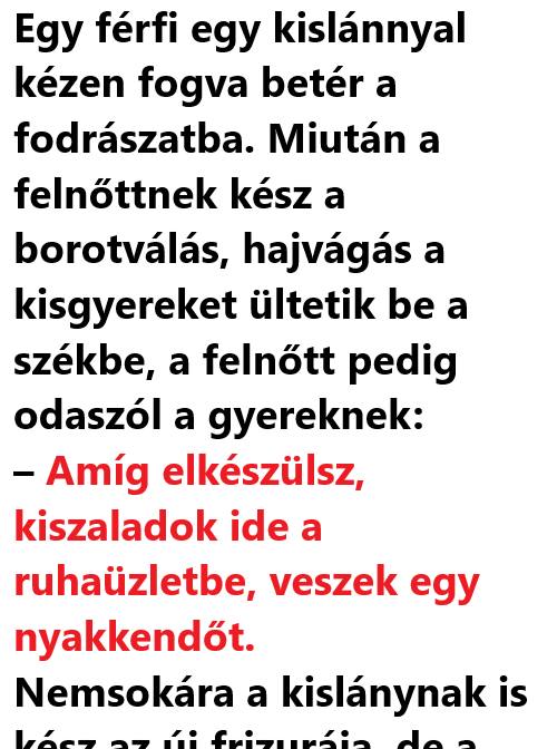 – Nem az apukám. Csak egy idegen bácsi, aki kézen fogott az utcán, és azt mondta: “Gyere, kislányom, bemegyünk ide egy ingyen hajvágásra”.
